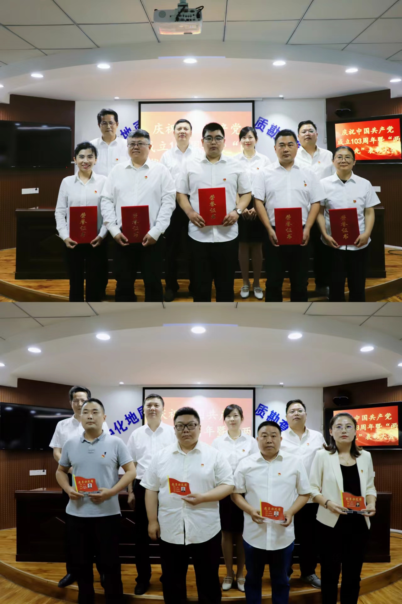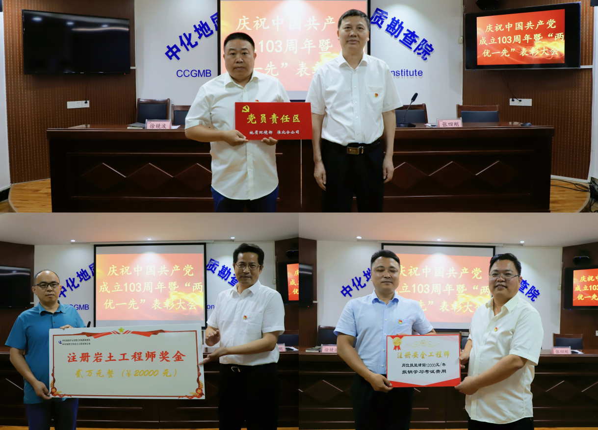 院(公司)党委对1个先进基层党组织、2名优秀共产党员、2名优秀党务工作者进行了表彰并颁发荣誉证书,并为党员示范岗党员、党员责任区代表进行授牌,为注册安全工程师颁发了荣誉证书、注册岩土工程师发放了奖金。