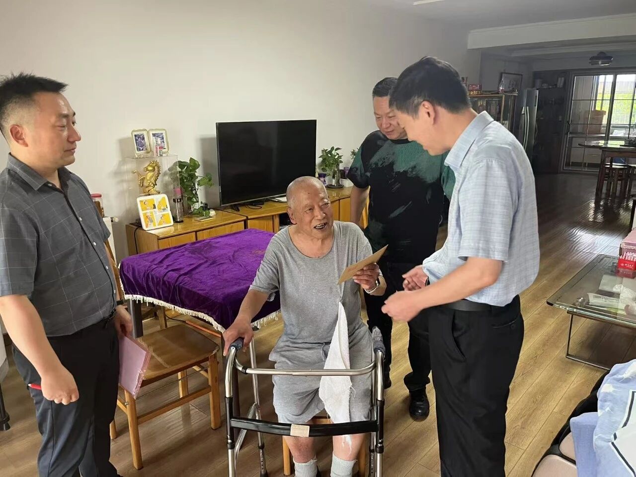 七一前夕,院(公司)党委副书记、院长古立峰赴连云港慰问离休党员李严,与其亲切握手、促膝长谈,关切询问老人日常饮食起居、身体康复治疗等情况,叮嘱老人一定要做好防暑降温措施,注意休息,希望其能一如既往关心支持单位各项工作,多提宝贵意见和建议,为单位发展再添助力。古立峰为其送上慰问金,并致以亲切问候和美好祝福,祝愿老人身体安康、阖家幸福。