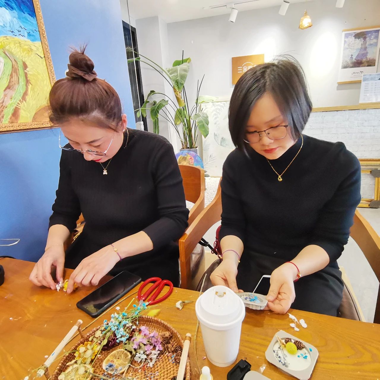 制作香薰的女神们挑选出自己喜欢香皂、精油和花束后,跟着画舍老师剪香皂与花瓣,滴入精油,小心搅拌,加热融蜡……精心调制最心仪的味道。香薰蜡烛做好后,又亲自裁剪花枝、布置香薰花束,处处尽显巧思。