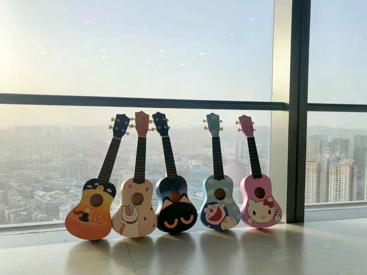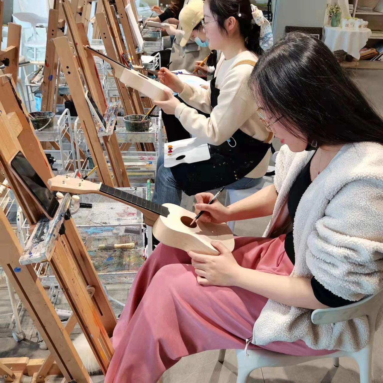 画室老师用简洁的语言介绍了手工制作尤克里里的步骤,做琴架、上琴桥、手绘图案、上弦调音……女神们认真聆听、专心制作,拼接、钻孔、拧螺丝、调色、绘制自己心仪的图案、上琴弦、调音,个个沉入其中,尽享手工制作的快乐。