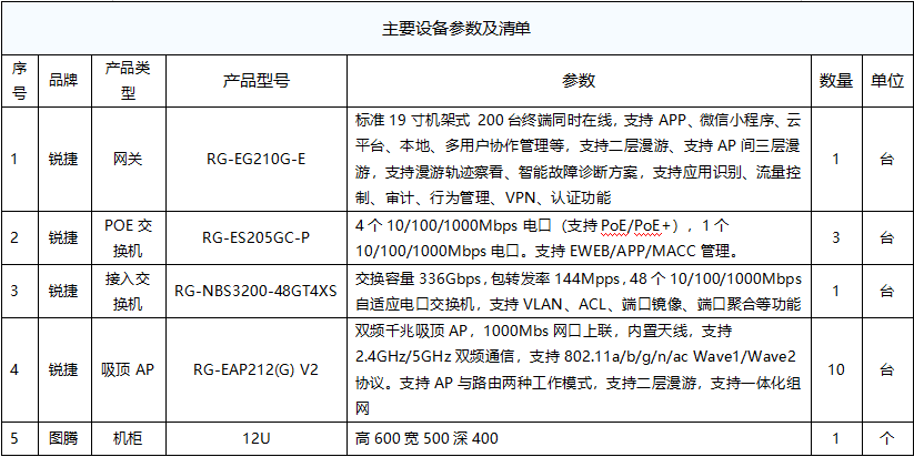 本次改造工程为便于后期的维护,经市场对比及综合研判,网络主要设备采用锐捷系列产品,所需网线要求为国标六类线,电源线、理线架、配线架等均需满足国标要求,线材及辅材踏勘时自行计算并和设备一起报价,设备详细参数如下: