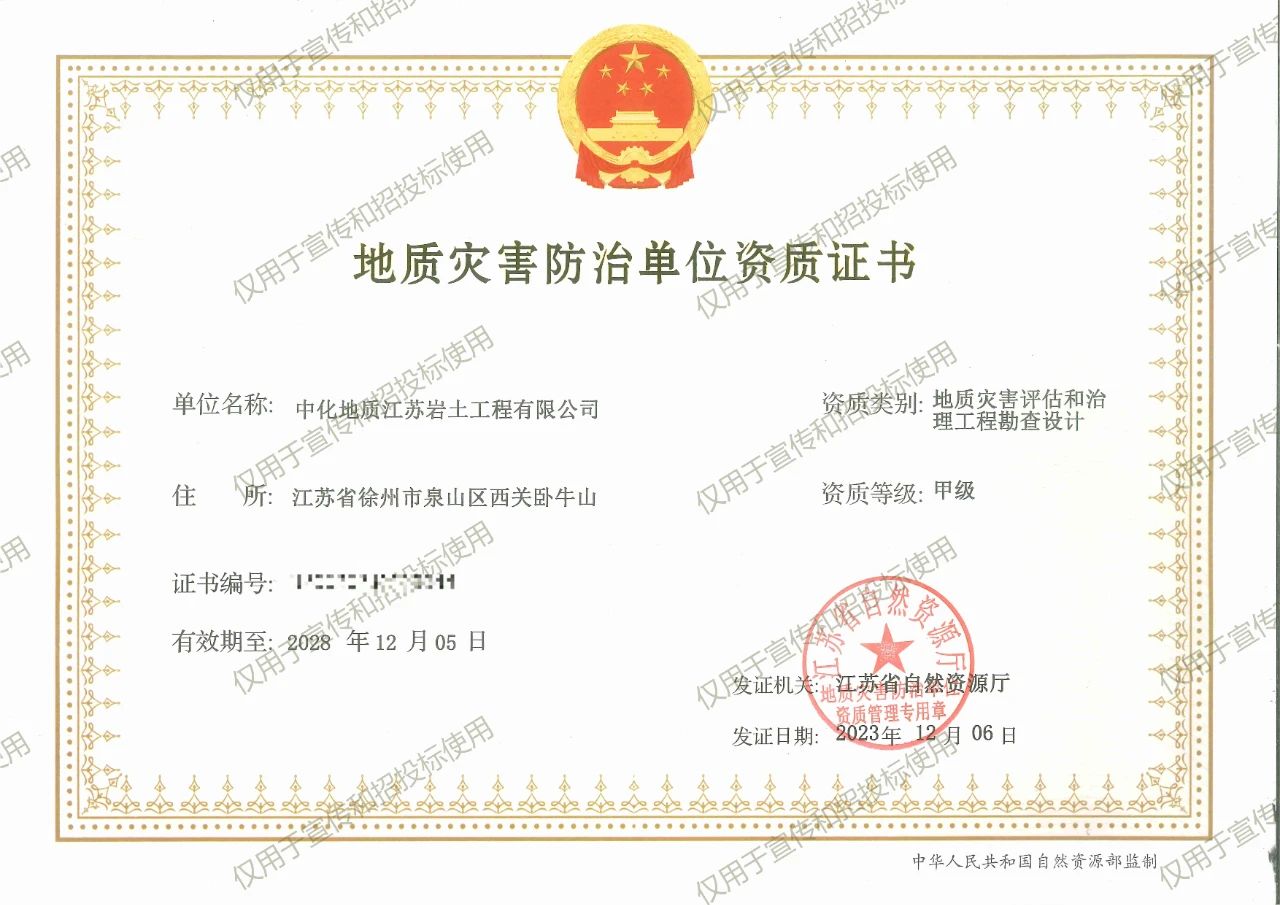 近日,我院喜获由中华人民共和国自然资源部监制,江苏省自然资源厅颁发的地质灾害评估和治理工程勘查设计甲级资质证书。